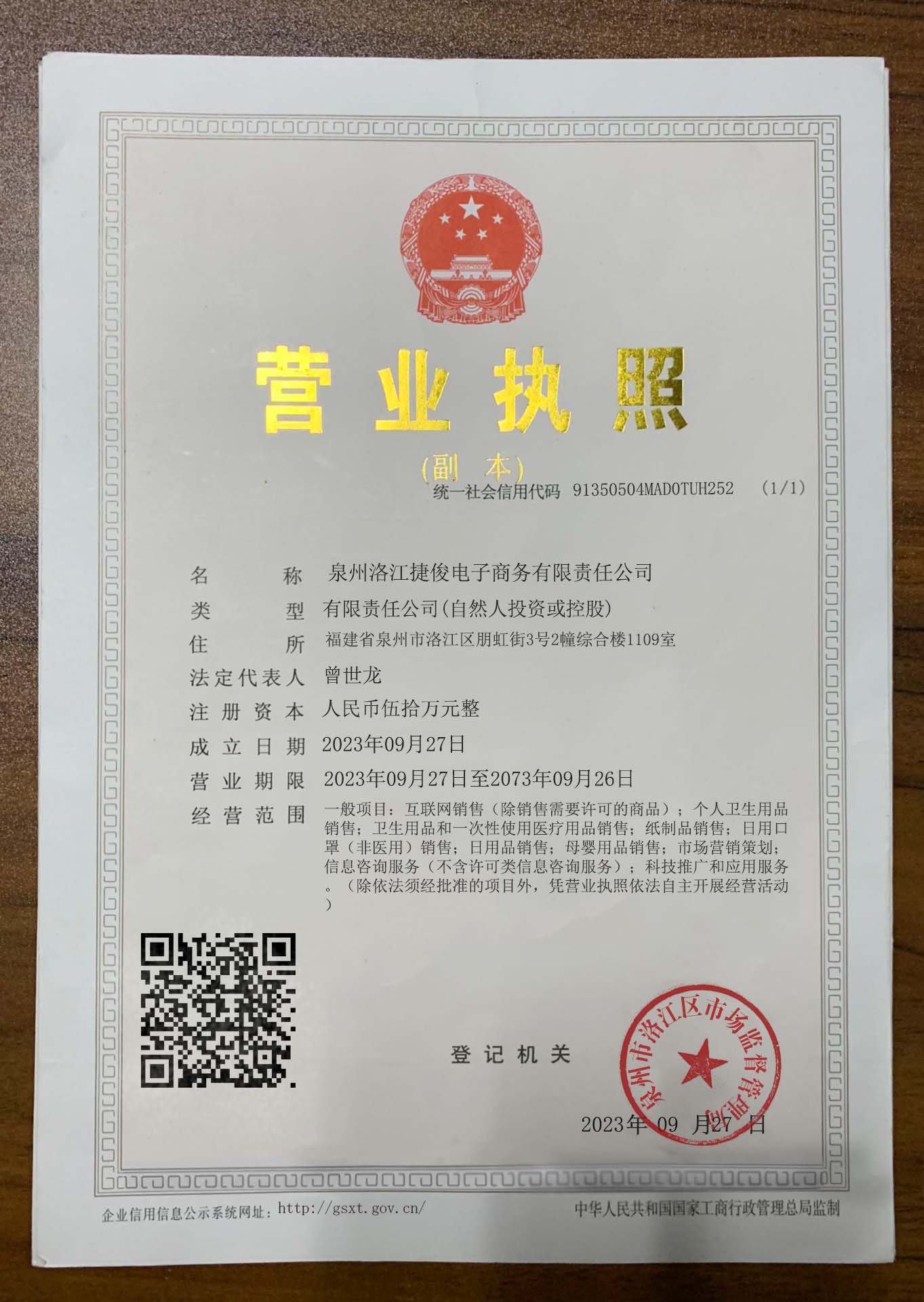 Corporate name:Quanzhou Luojiang Jiejun E-commerce Co., Ltd